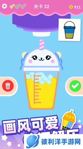 1、2D可爱卡通风格的休闲益智游戏,您可以模拟制作不同口味的奶茶。