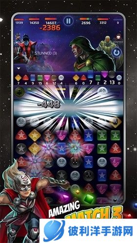 2、战斗的机制非常简单,通过消除宝石来进行不同颜色的宝石象征着不同的超级英雄。每次消除都会激活屏幕上方的超级英雄进行相应的攻击,有时还会触发华丽的动画效果。