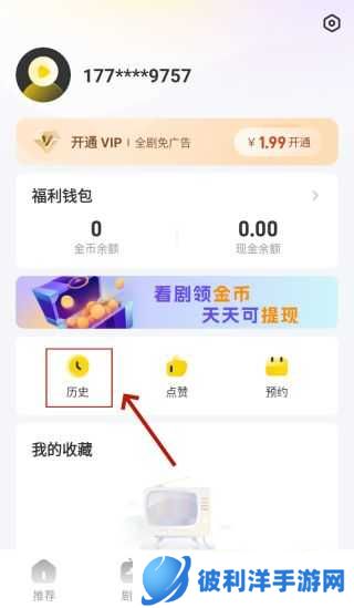 想要删除星芽短剧历史记录,就需要先完成手机号登录,之后,点击“历史”,进入“观看历史”界面。