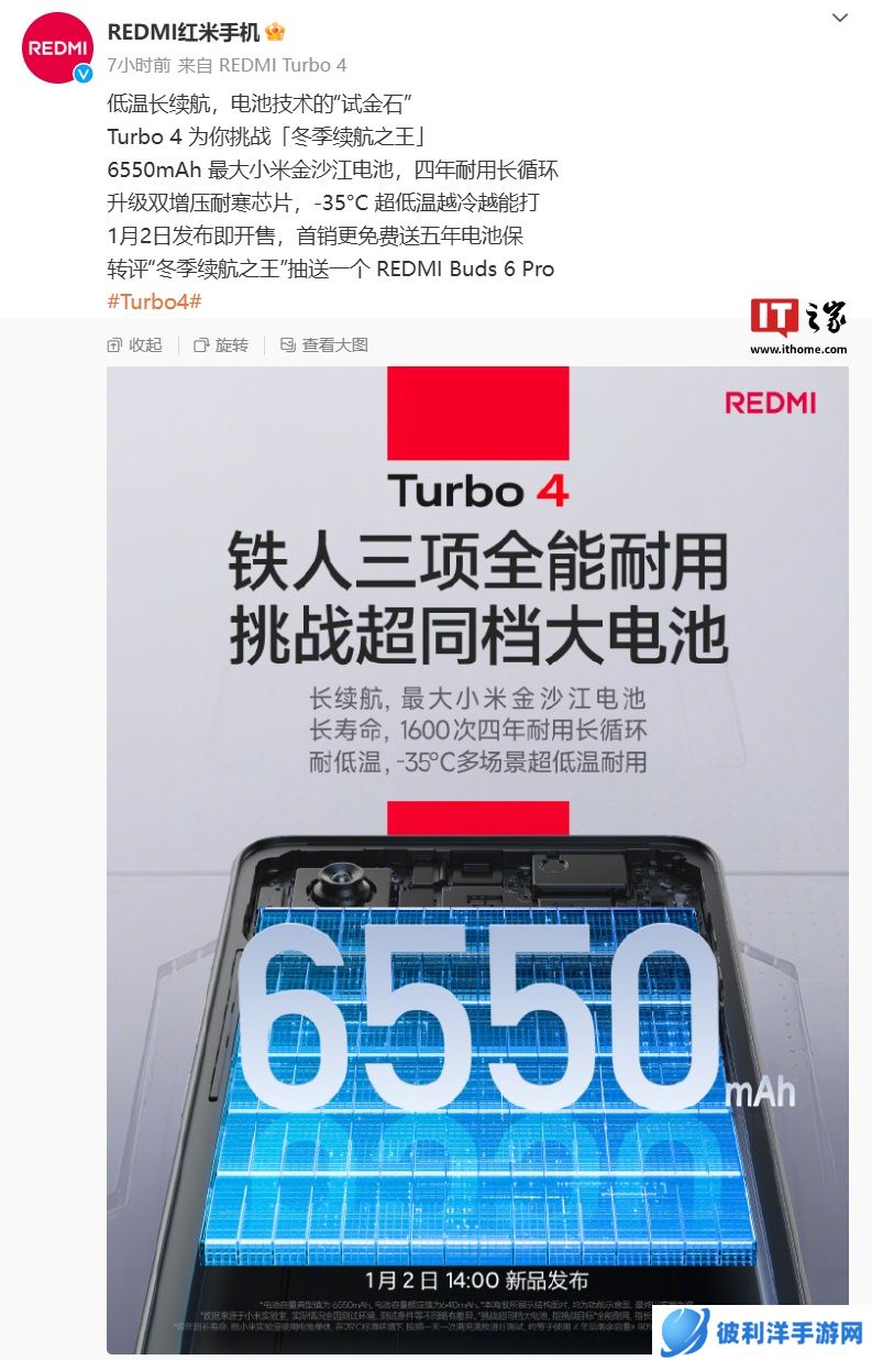 据本站今日早些时候报道,REDMI Turbo 4 手机搭载 6550mAh 最大小米金沙江电池,支持 1600 次四年耐用长循环。该机还配备双增压耐寒芯片,号称 -35°C 超低温也能使用。