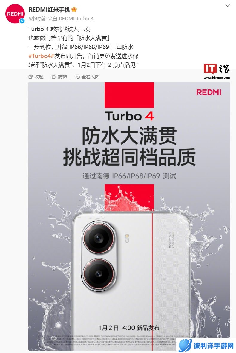 根据官方最新预热,小米 REDMITurbo 4 手机升级 IP66 / IP68 / IP69 三重防水,并通过了南德 IP66 / IP68 / IP69 测试,官方宣称「防水大满贯」。