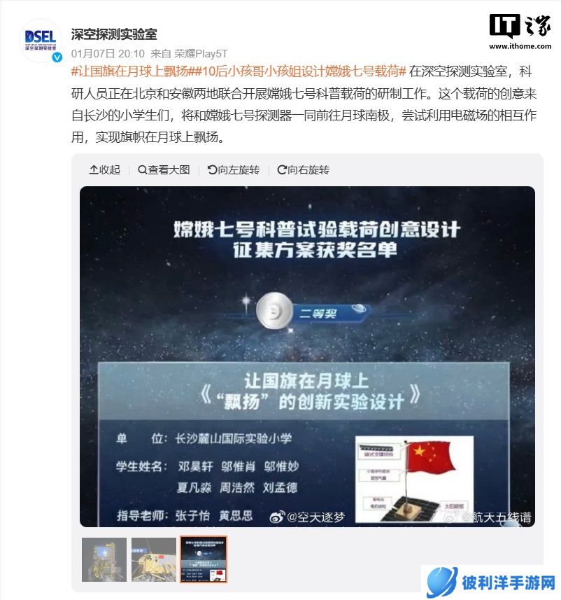本站从深空探测实验室官方获悉,科研人员正在北京和安徽两地联合开展嫦娥七号科普载荷的研制工作。这个载荷的创意来自长沙的小学生们,将和嫦娥七号探测器一同前往月球南极。