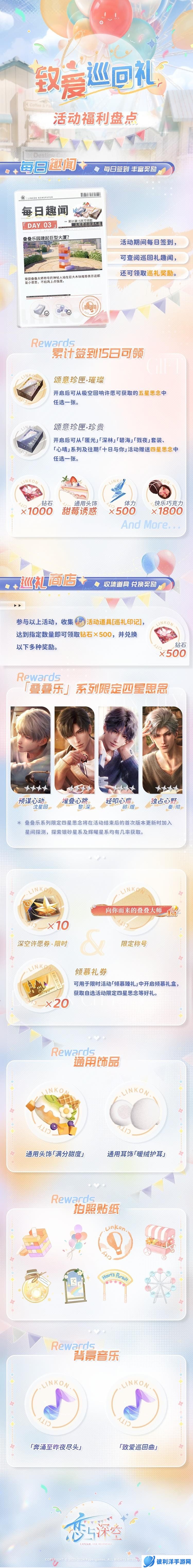玩家可以通过参与“巡礼通行证”DIY通行证、“巡行札记”阅读活动剧情、“心驰所向”和“叠叠乐园”趣味小游戏以及“撷忆寻响”收集小故事等活动,解锁纪念互动藏品和丰富剧情。此外,还有每日趣闻签到活动,累计签到15日即可领取“自选五星思念1”、“自选四星思念1”、“钻石*1000”以及通用头饰“甜莓诱惑”等豪华奖励。