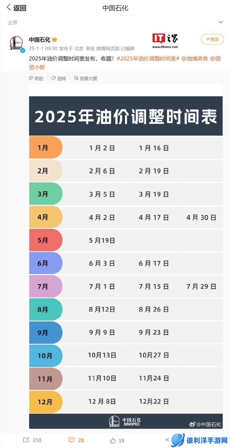 本站 1 月 2 日消息,@中国石化 昨日(1 月 1 日)发布微博,发布 2025 年国内成品油调整时间表,今年第一轮调价窗口将于 1 月 2 日 24 时开启,本轮调价上调与搁浅可能性并存。