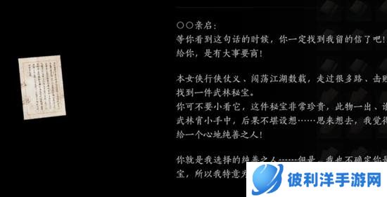 阅读“摇虎女侠的戏”:打开背包,在书信栏找到并阅读“摇虎女侠的戏”,然后查看藏宝图线索二。