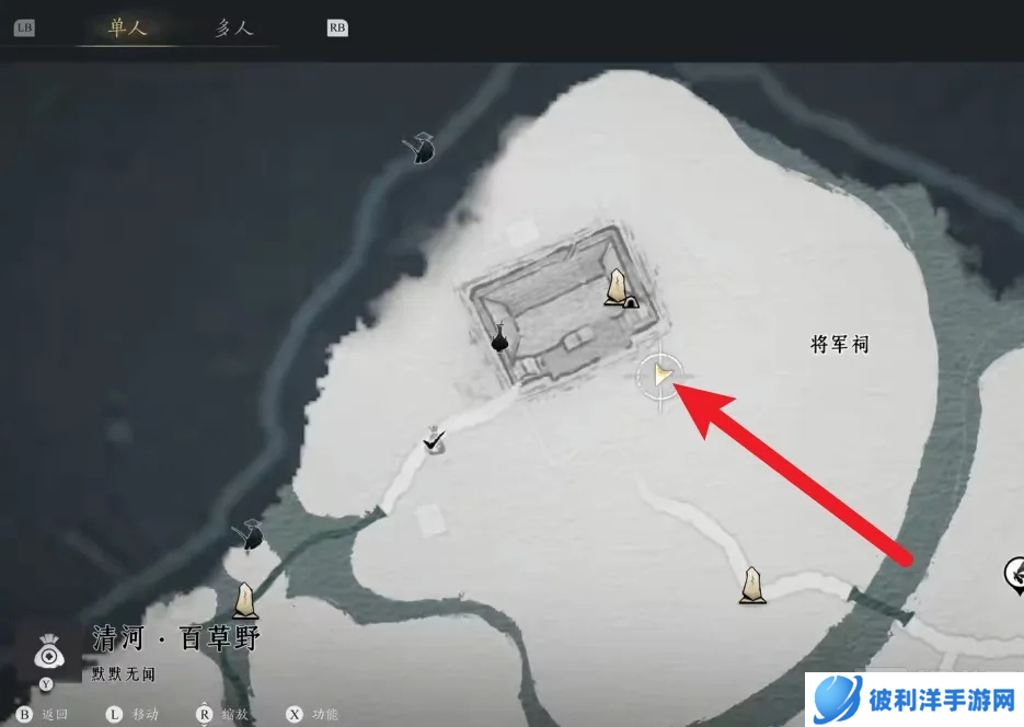 当你打开《燕云十六声》游戏后,首先需要在游戏地图中找到并点击前往将军祠的箭头位置。这个地点是摸猫活动的起点。