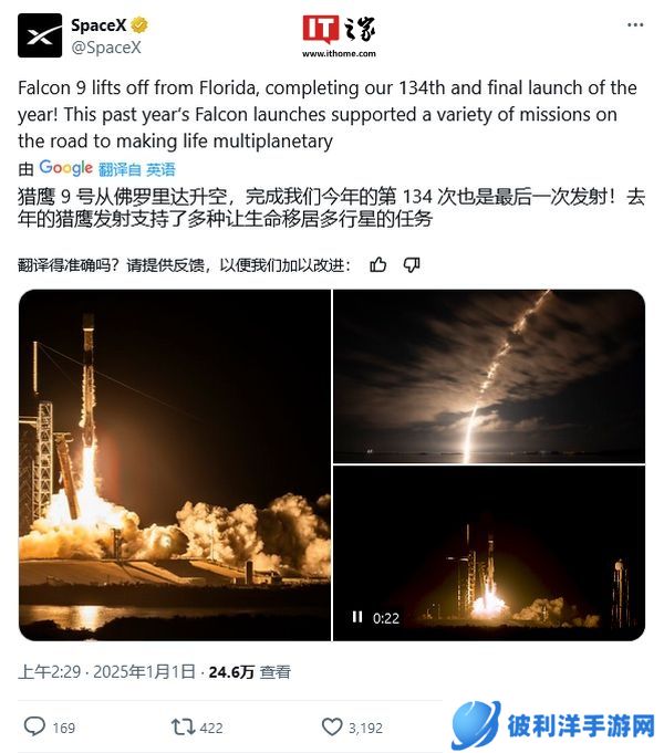 本站 1 月 1 日消息,SpaceX 今天(1 月 1 日)在 X 平台发布推文,宣布猎鹰 9 号火箭于 12 月 31 日在佛罗里达升空,2024 年火箭发射正式收官,成功完成 134 次发射。
