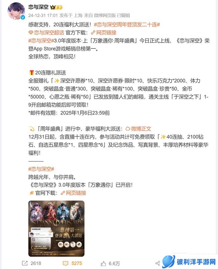 微博中表达了对玩家支持的感谢,并宣布了一系列福利活动。其中包括全服赠礼,玩家可以获得包括深空许愿券、快乐巧克力、体力、突破晶盒和金币等多种游戏内物品,这些礼物已经发放到玩家的邮箱中,玩家在通关主线任务“于深空之下”1-9后可以开启邮箱领取,邮件有效期至2025年1月6日23:59。