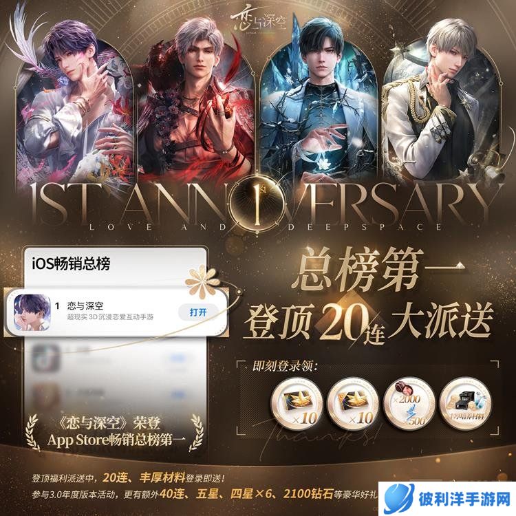 《恋与深空》3.0年度版本“万象遇你·周年盛典”正式上线。官方微博账号“恋与深空”在2024年12月31日17:01发布了一条微博,庆祝游戏荣登App Store游戏畅销总榜第一。