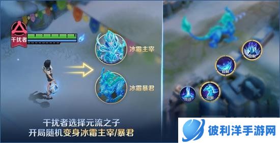 默认角色:干扰者默认选择元流之子,开局后随机变身成为冰霜主宰/冰霜暴君。
