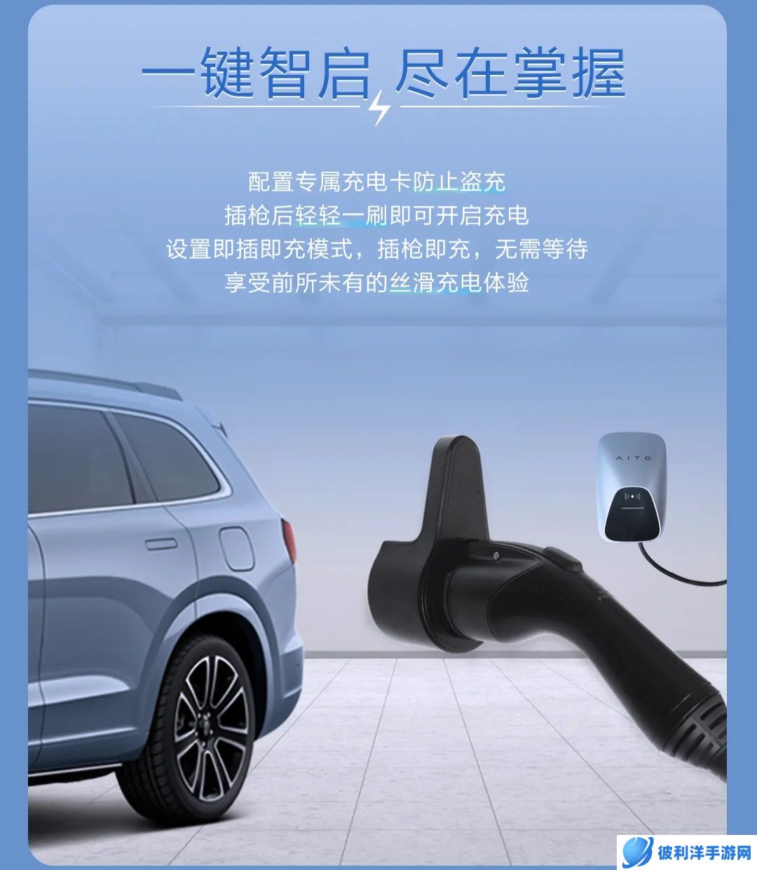 问界 2.0 PRO 家充桩配置专属充电卡防止盗充,插枪后轻轻一刷即可开启充电;可设置即插即充模式,插枪即充。