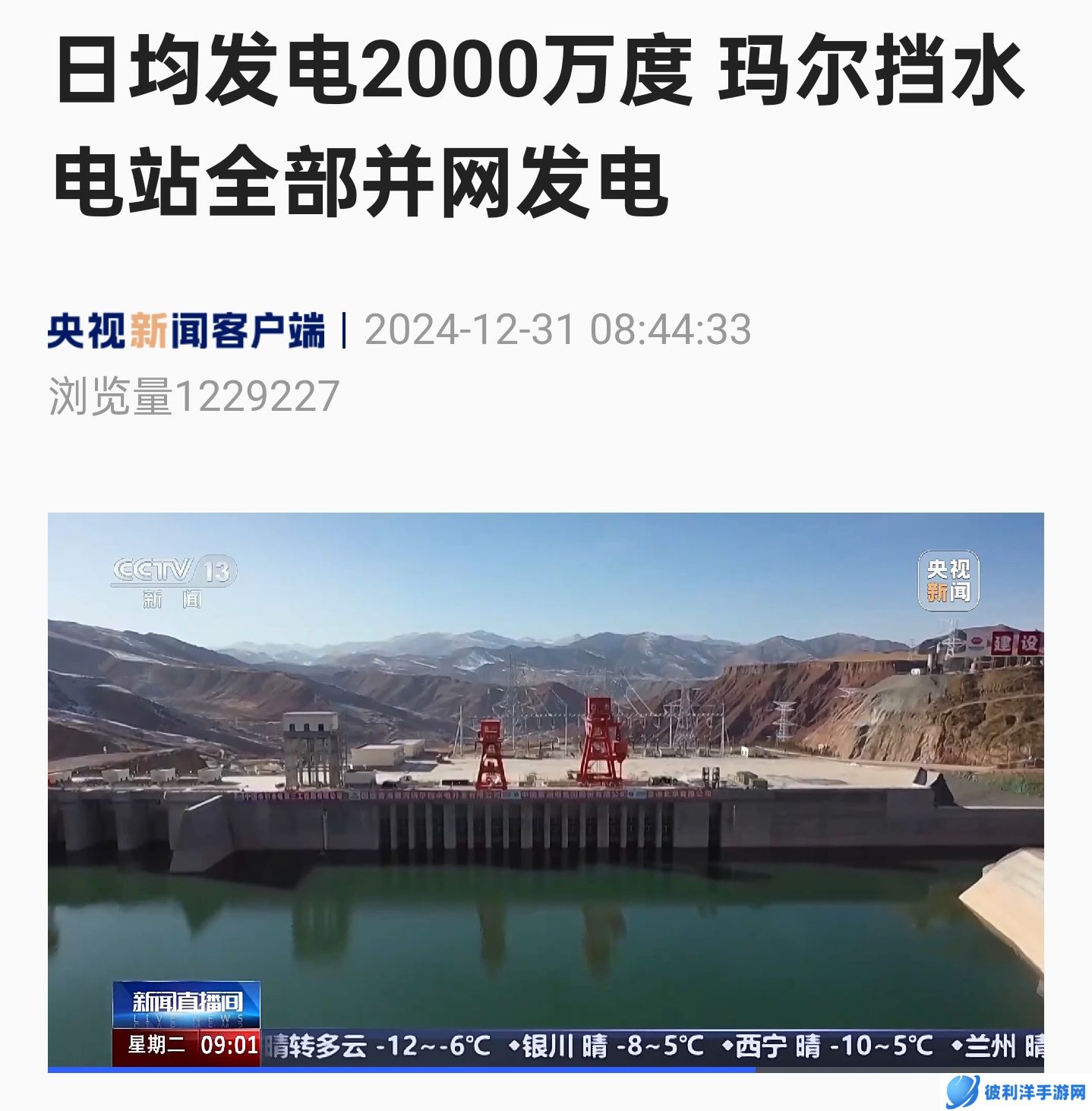 本站 12 月 31 日消息,据央视新闻报道,随着最后一台 2 号机组投产发电,黄河流域在建海拔最高、装机最大的水电工程 —— 玛尔挡水电站 5 台机组已全部并网发电。这标志着黄河上游青海段首个千万千瓦级“水风光蓄”多能互补全清洁能源一体化项目的核心工程全面建成,平均每日发电量达 2000 万度。