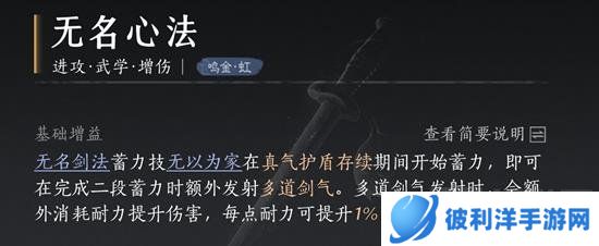 特点:无名心法提供基础的剑法支持,易水歌和威猛歌增强剑法的攻击力和连贯性,燎原星火为剑法增加额外的伤害效果。