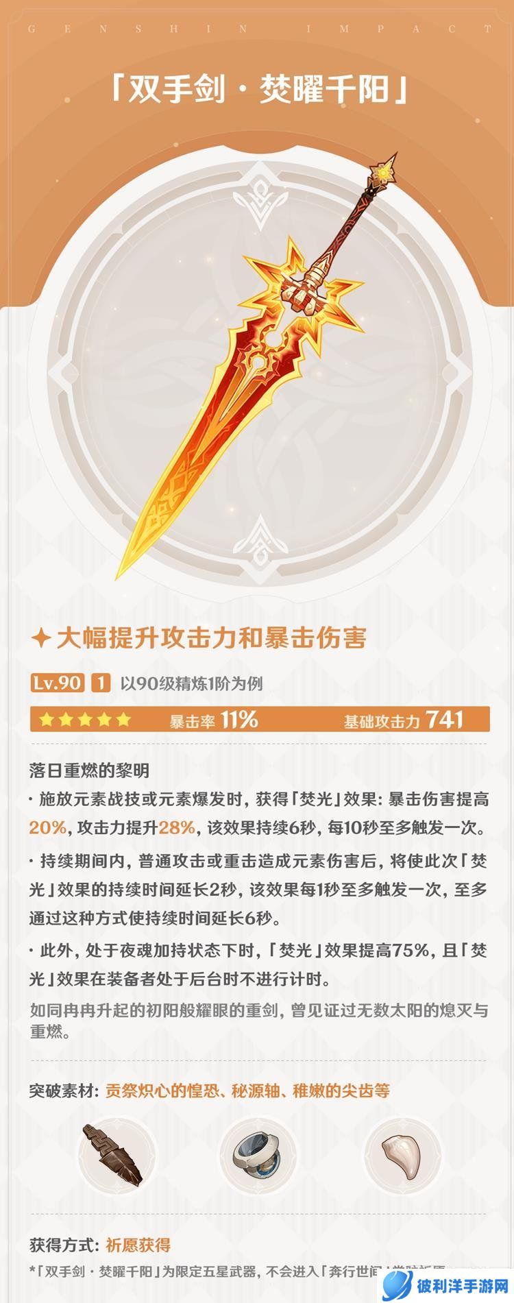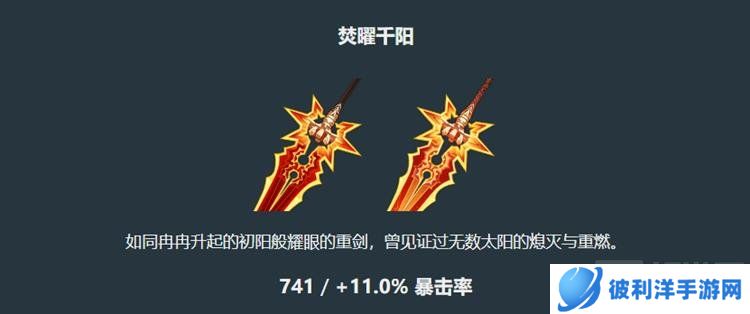 「焚曜千阳」的自身强度非常可观,无论是28%的攻击力提高还是20%的暴击伤害,对于一众双手剑输出角色来说,表现相当不错,是一把有着很高强度和泛用性的输出武器。