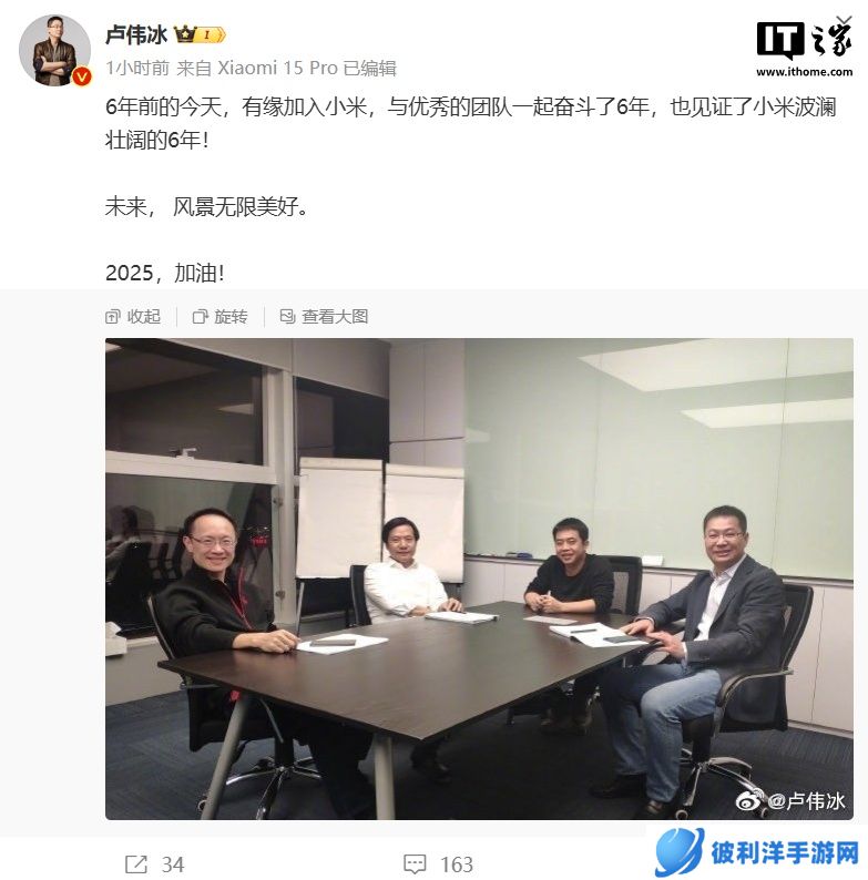 本站 1 月 2 日消息,小米集团合伙人、总裁、手机部总裁、小米品牌总经理卢伟冰今日发布微博,晒出 6 年前入职小米的照片,与雷军、林斌等人在会议室合照。