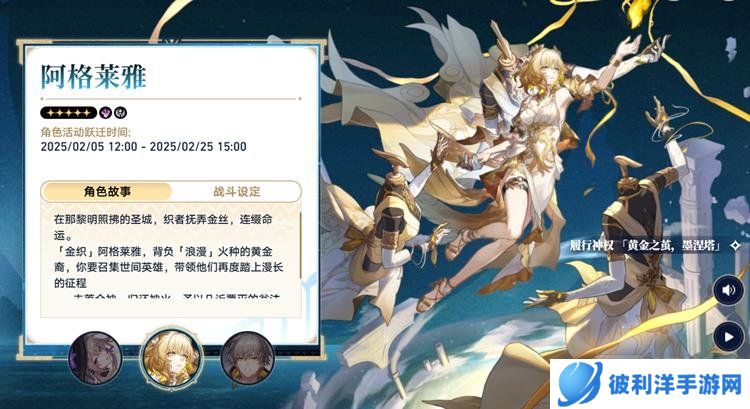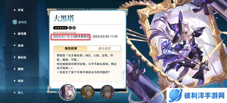 崩坏星穹铁道3.0新版本的版本中期卡池轮换将在2025年2月5日中午12:00进行,到时候大黑塔的卡池将会结束,阿格莱雅的卡池将会开启。