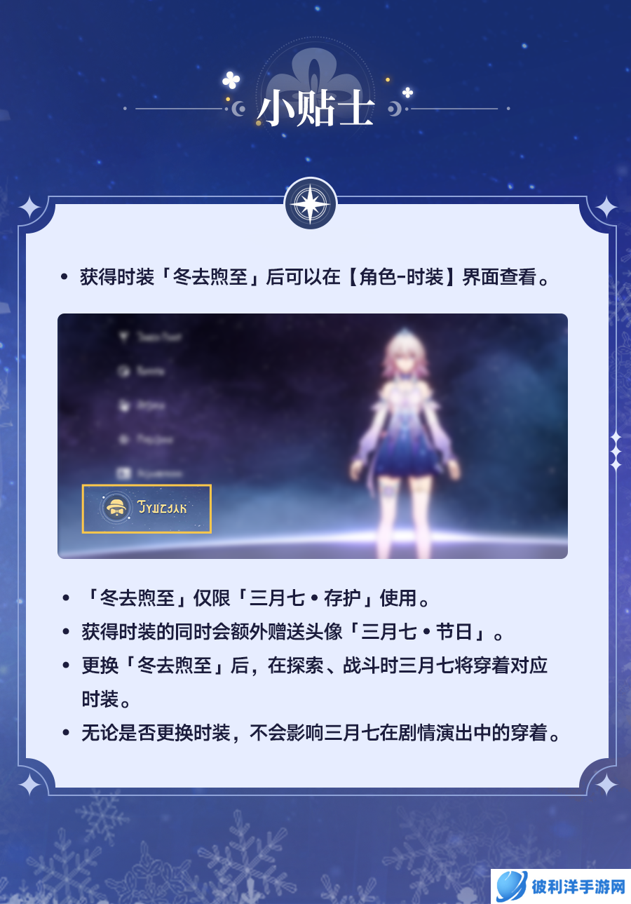 3.0版本期间登录游戏并解锁【角色】功能后即可领取「三月七·存护」的时装「冬去煦至」!活动结束后,时装「冬去煦至」将上架商店「协议商店」。时装售价为古老梦华*1680。不论是直接领取还是在商店中购买,获得时装后都可获得时装及对应头像。