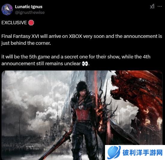 外媒tech4gamers消息,据业内人士Lunatic Ignus透露,《最终幻想16》可能将在2025年1月23日的Xbox开发者直面会上宣布登陆Xbox平台。
