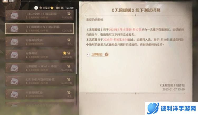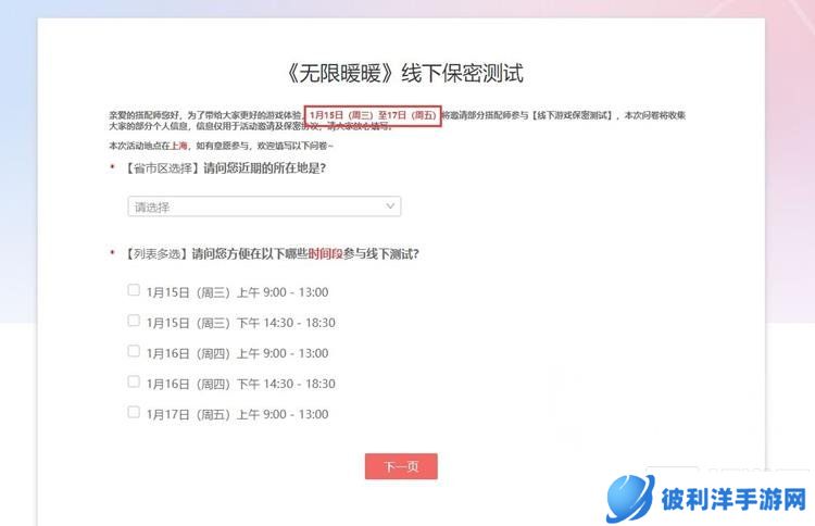 叠纸公司计划于2025年1月15日至1月17日举办这次线下保密测试,招募截止时间为2025年1月8日23:59。如果顺利入选,玩家将在1月10日通过问卷中填写的联系方式收到通知,并进行后续流程。