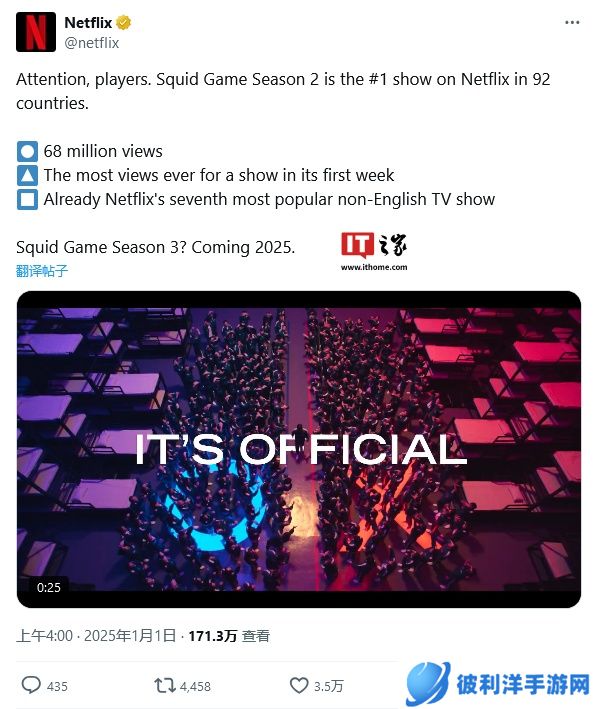 本站 1 月 2 日消息,Netflix 热播剧《鱿鱼游戏》第二季自 2024 年 12 月 26 日上线以来,取得了巨大成功,首周全球观看次数已达 6800 万,总观看时长为 4.876 亿小时,刷新前作于 2021 年 9 月第四周(20 至 26 日)创下的 4.4873 亿小时的纪录。