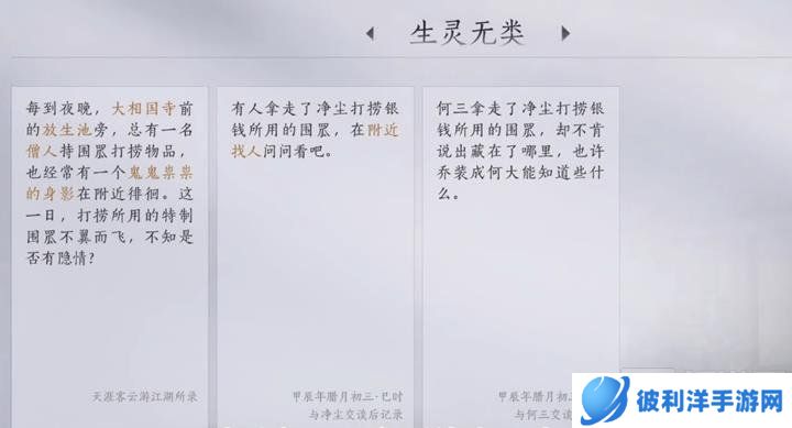 以上就是燕云十六声生灵无类万事知任务的详细攻略了。当你完成了所有的挑战并将道具交给和尚后,任务也就此结束。如果你在游戏中遇到了困难或不确定如何继续,请参考上述步骤。如果这篇攻略对你有帮助,还请点个收藏关注一下切游网,各位读者的支持就是我们持续更新的最大动力。