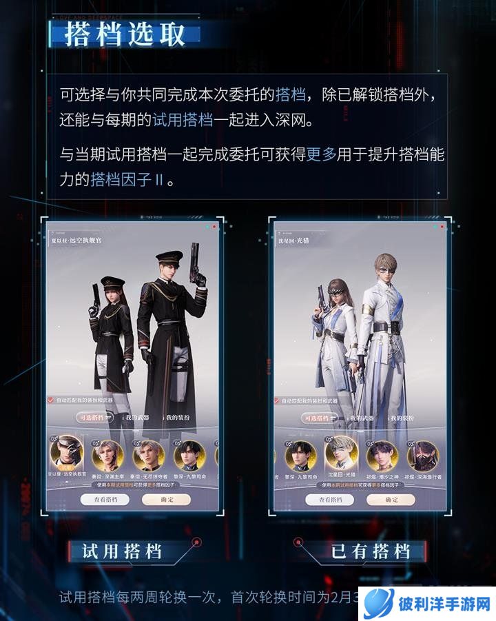 玩家可选择已解锁的搭档或当期试用搭档参与推演,与试用搭档完成委托可获得更多搭档因子,用于提升搭档能力。试用搭档每两周轮换一次,首次轮换时间为1月23日5:00。