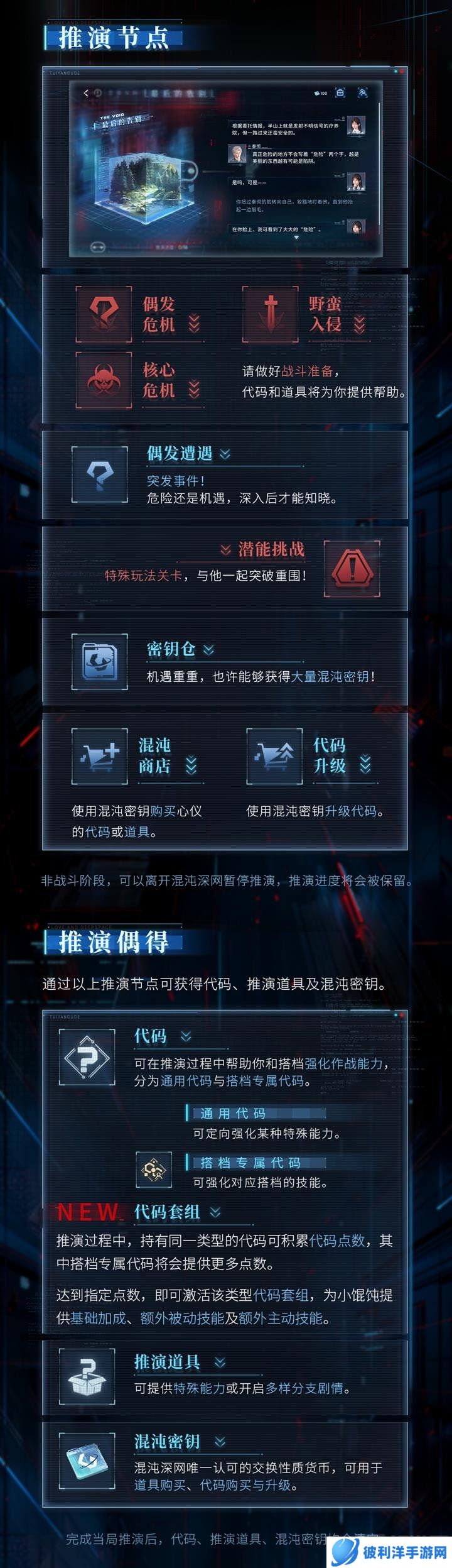 推演过程中,深网管理员A小馄饨将演算出需要解决的节点,包括战斗关卡和特殊玩法关卡。玩家需根据提示做出抉择,认真对待每一次选择。完成推演节点可获得代码、推演道具及混沌密钥。