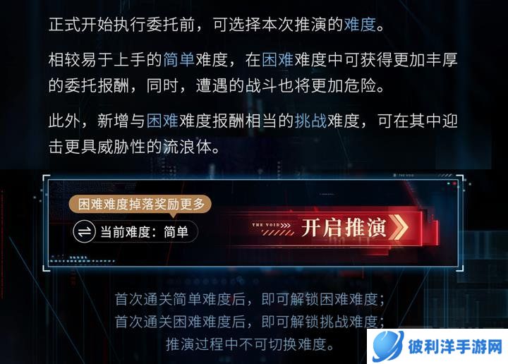 在「混沌深网全新委托:最后的告别」活动中,玩家可从简单、困难和挑战三种难度中选择推演任务。简单难度适合新手玩家,易于上手但报酬较少;困难难度战斗更具挑战性,报酬更丰厚;挑战难度为新增模式,敌人威胁性更高,报酬与困难难度相当。首次通关简单难度后解锁困难难度,首次通关困难难度后解锁挑战难度,推演过程中不可切换难度。