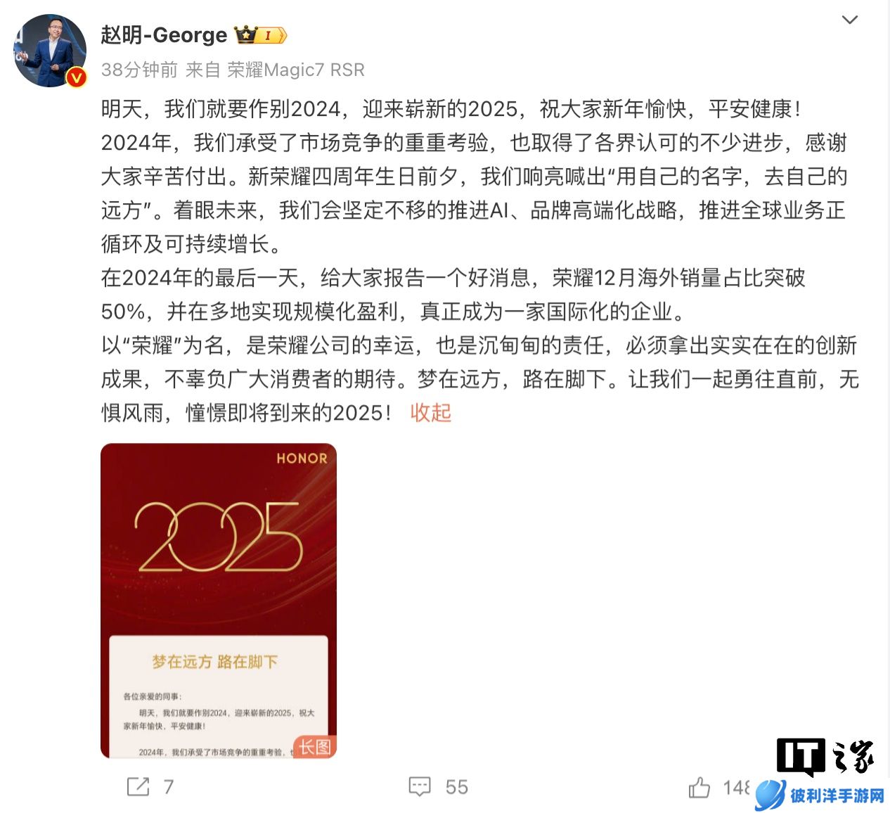 本站 12 月 31 日消息,今天下午,荣耀 CEO 赵明在新年致辞中谈到,荣耀 12 月海外销量占比突破 50%,并在多地实现规模化盈利,真正成为一家国际化的企业。