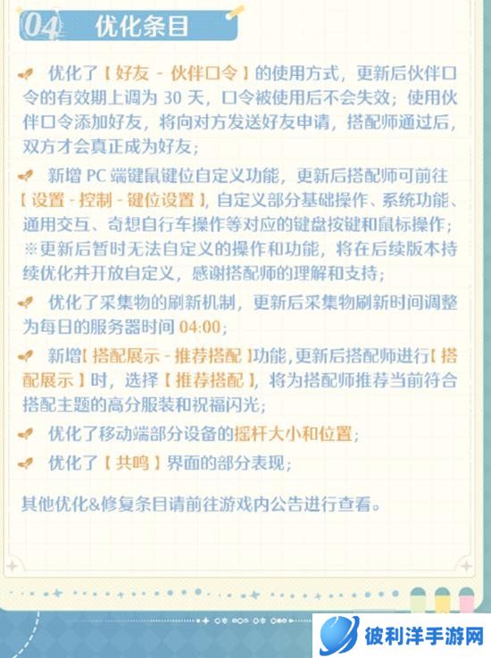优化了【好友-伙伴口令】的使用方式,更新后伙伴口令的有效期上调为30天,口令被使用后不会失效。使用伙伴口令添加好友,将向对方发送好友申请,搭配师通过后双方才会真正成为好友。