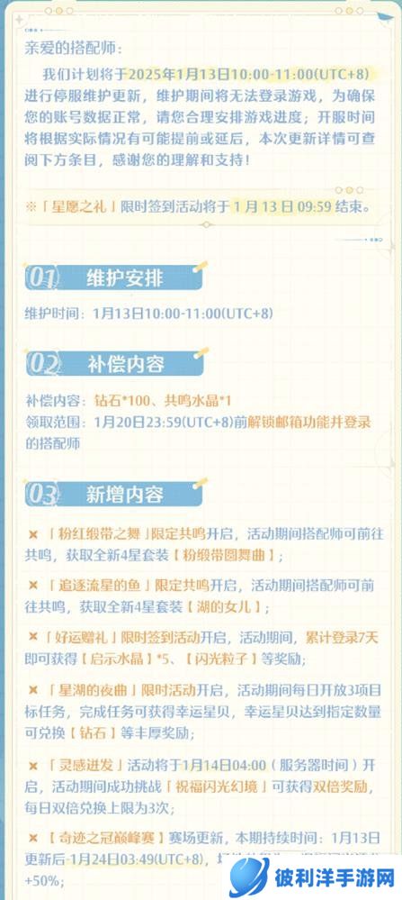 《无限暖暖》于2025年1月13日进行了停服维护更新,以下是详细的更新内容和安排,感兴趣的小伙伴快来跟随小编的脚步一起看看吧!