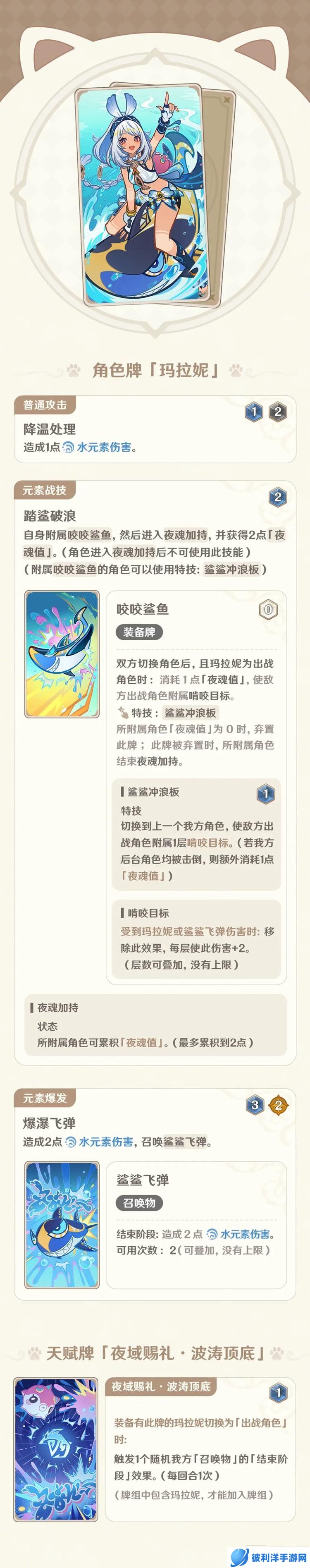效果:双方切换角色后,且玛拉妮为出战角色时:消耗1点“夜魂值”,使敌方出战角色附属“啃咬目标”。特技:鲨鲨冲浪板。所附属角色“夜魂值”为0时,弃置此牌;此牌被弃置时,所附属角色结束“夜魂加持”。解析:咬咬鲨鱼是玛拉妮的控场核心,能够在敌方切换角色时对其施加负面效果,限制其行动。同时,特技“鲨鲨冲浪板”为玛拉妮提供了额外的战术选择。四、获取方式