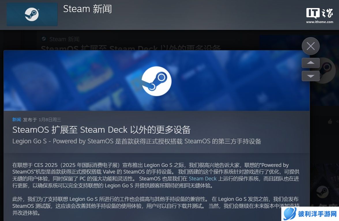 本站 1 月 8 日消息,据 Steam 官方新闻中心消息,SteamOS 将扩展至 Steam Deck 以外的更多设备。在 CES 2025 上亮相的联想Legion Go S 掌机是首款获得正式授权搭载 Valve 的 SteamOS 的第三方手持设备。