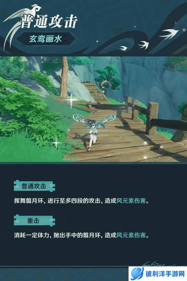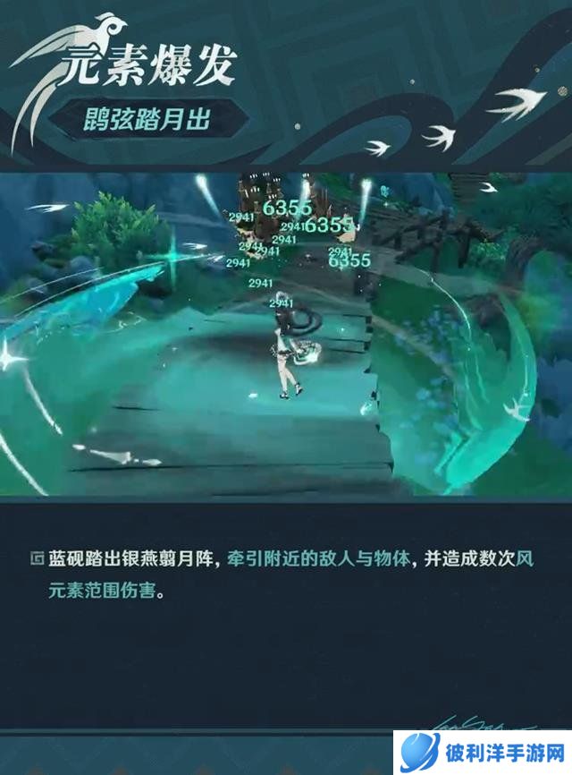 元素爆发“鹍弦踏月出”,蓝砚踏出银燕翦月阵,牵引附近的敌人与物体,并造成数次风元素范围伤害。其冷却时间为15秒,元素能量消耗为60。
