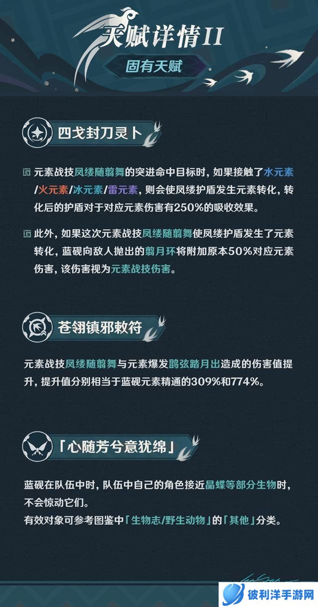 蓝砚的被动技能“心随芳兮意犹绵”,使她在队伍中时,队伍中自己的角色接近晶蝶等部分生物时,不会惊动它们。