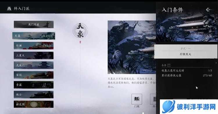 天泉入门条件为60侠义值和三个不义之财。侠义值通常通过完成支线任务获得,不义之财可以通过以下方式获取。