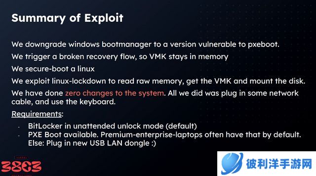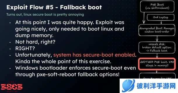 Lambertz 利用了一种名为“bitpixie”的攻击手段,通过安全启动运行旧版 Windows 引导加载程序,将加密密钥提取到内存中,再利用 Linux 系统读取内存内容,最终获取 BitLocker 密钥。