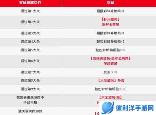当肠肠通过「暴跳西游路」中的大关后即可领取对应的通关奖励,不仅可以获得超级彩虹补给箱,缤纷补给箱钥匙等奖励,还可以获得【大圣披风】外套等皮肤奖励!