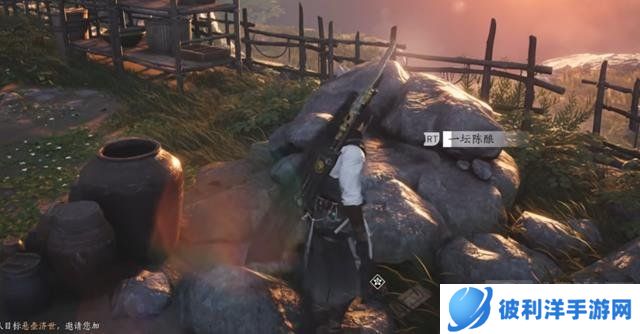 寻找玉笛:在石头堆处寻找留下的东西:一坛陈酿和玉笛。