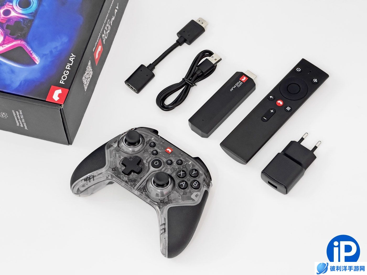 根据俄罗斯媒体 iphones 分享的开箱视频,Fog Play 游戏电视棒包装盒内含 HDMI 接口的电视盒、电源适配器、micro-USB 线、HDMI 角度转换器、遥控器和一个游戏手柄。