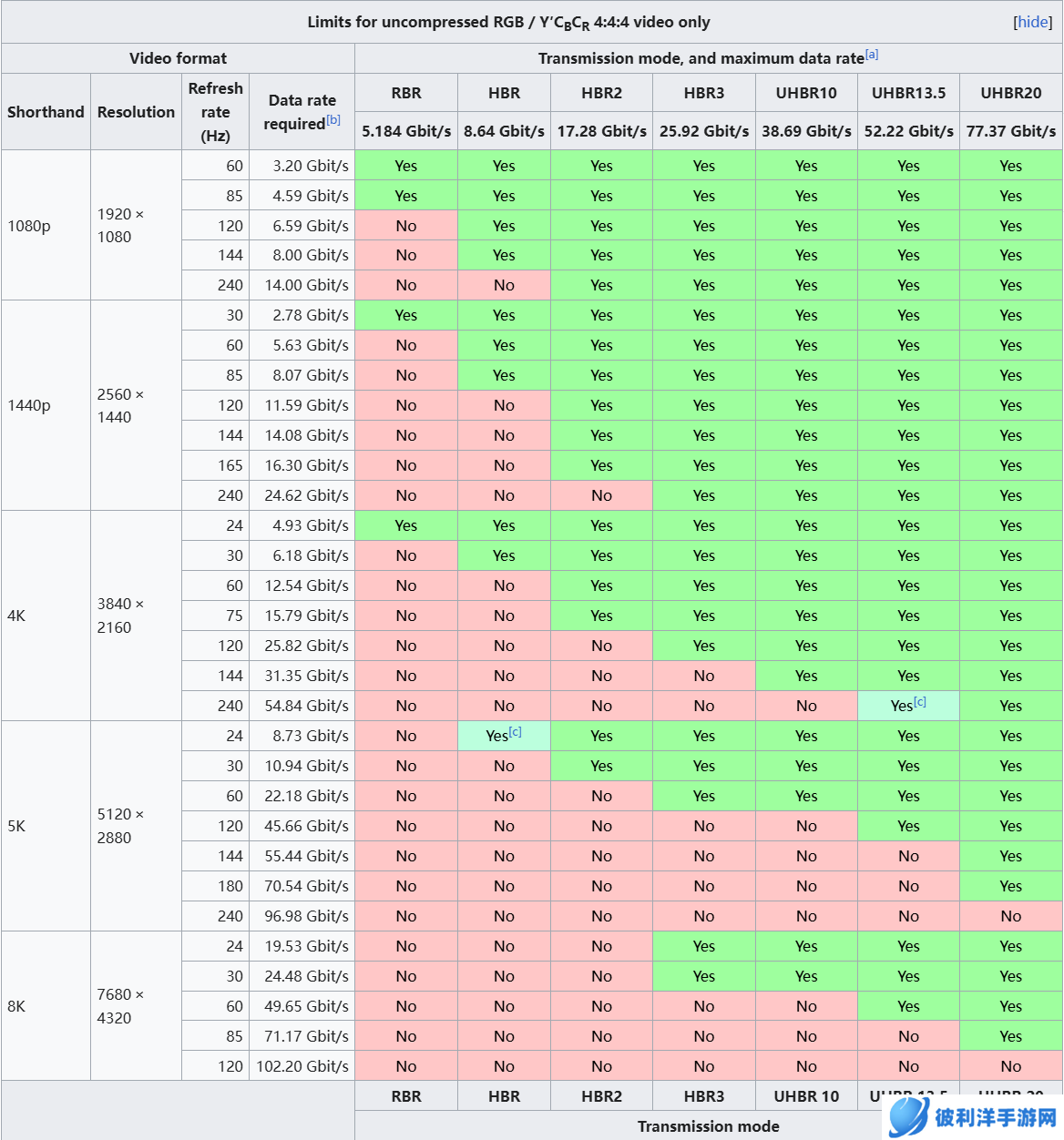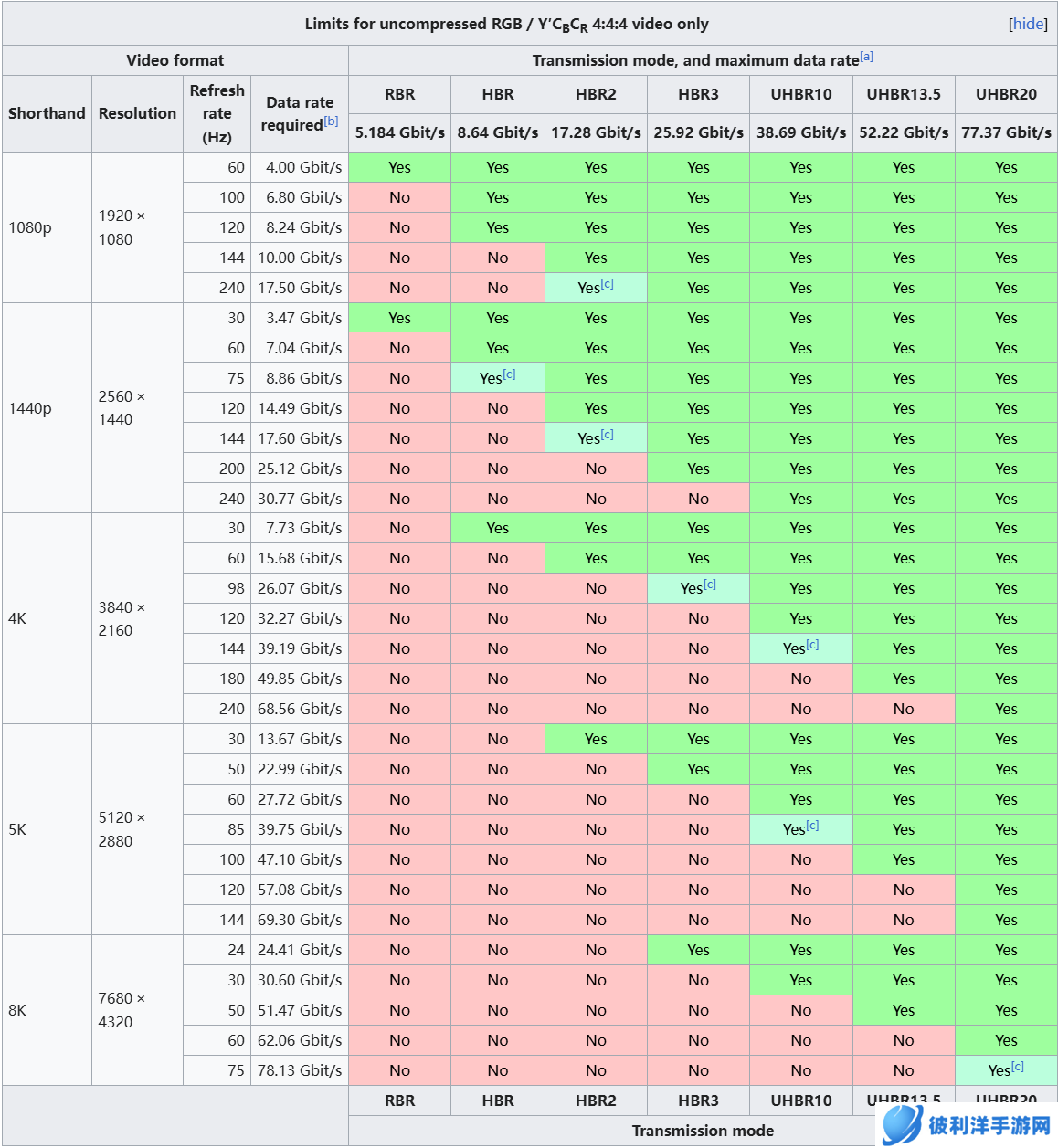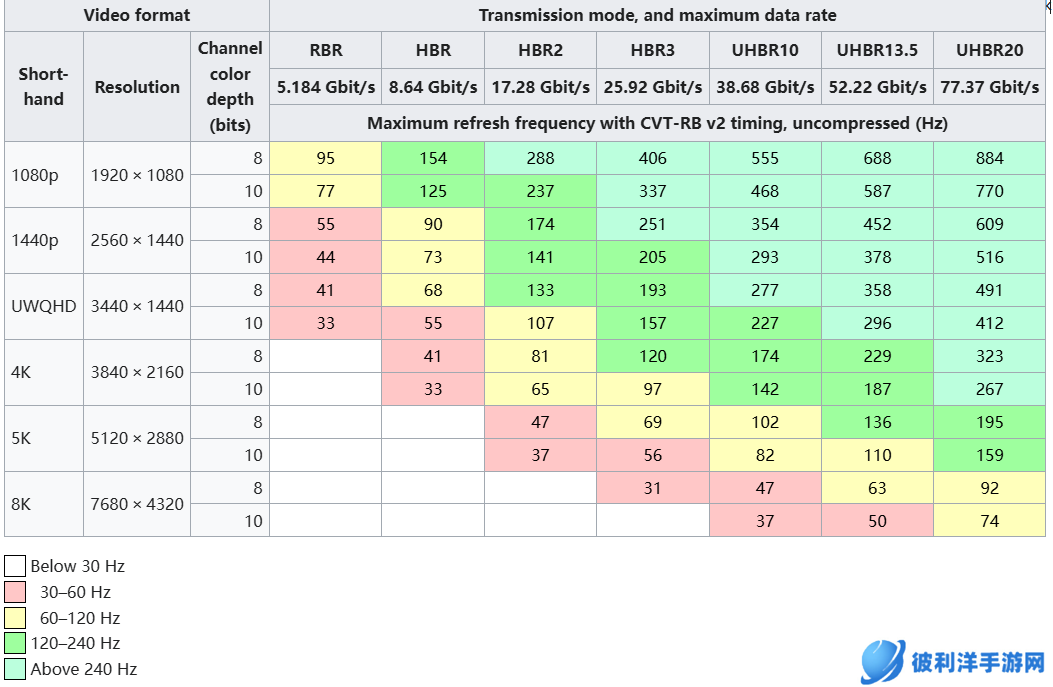 本站注:UHBR20 无需 DSC 压缩即可实现4K 240Hz 10bit 显示输出,单通道带宽提升到 20 Gbps,总带宽可达 80 Gbps,当然最低也要求 DP80 线材。