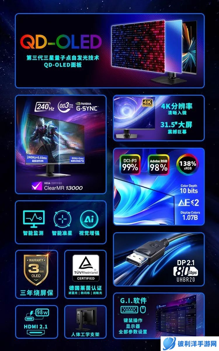 京东微星 MPG 322URX QD-OLED7999 元直达链接这款新品 MPG 322URX QD-OLED 采用 31.5 英寸的三星新一代 QD-OLED 面板,支持 3840x2160 的分辨率与 240Hz 刷新率,面板响应时间 0.03ms。