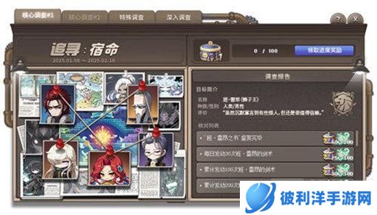 玩家可接取追寻:宿命任务,点击军团长图片完成对应任务,即可增加追寻调查的进度,并领取庆典记录交换券奖励。