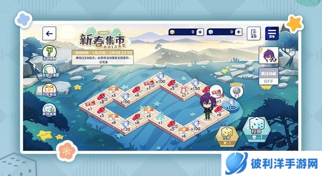 在「新春集市」活动中,制作人每日登录可免费获得一次投掷骰子的机会。投掷骰子后,选定的偶像将按照骰子点数向前移动相应的格子数,制作人将获得偶像最终停留格子对应的奖励。