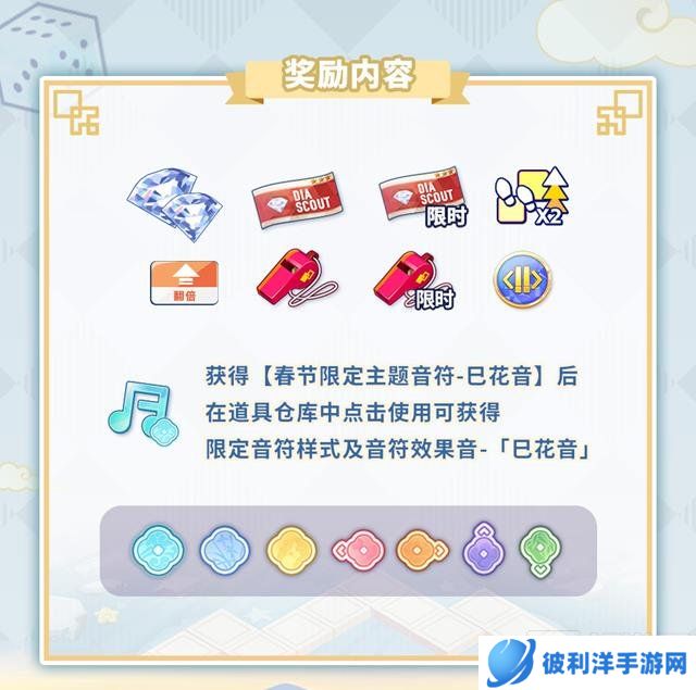 【春节限定主题音符-巳花音】:在道具仓库中使用后,可获得限定音符样式及音符效果音「巳花音」,为你的游戏体验增添新春氛围!