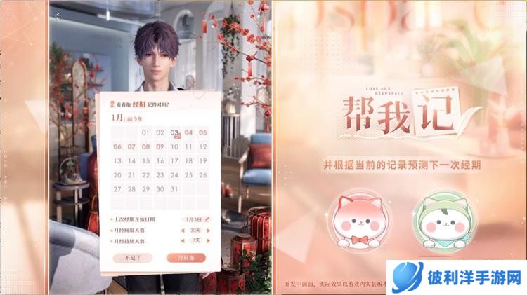 最后,【经期预测】功能是一个非常贴心的设计。你可以告诉男主最近的经期信息,他会将这些信息记录在小日历上,便于之后的预测与提醒。通过不断记录自己的经期,系统可以不断学习,预测的准确性也会逐渐提高。这个功能对于那些希望更好地管理生理周期的玩家来说,无疑是一个巨大的帮助。