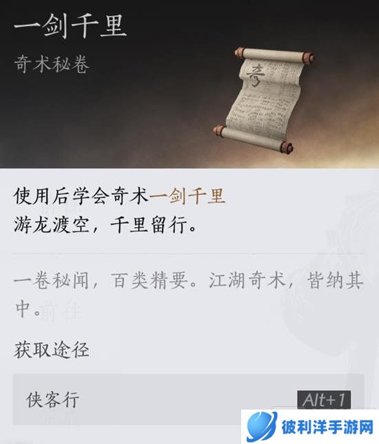 获得奇术秘卷后,学习该秘卷,即可学会“一剑千里”。