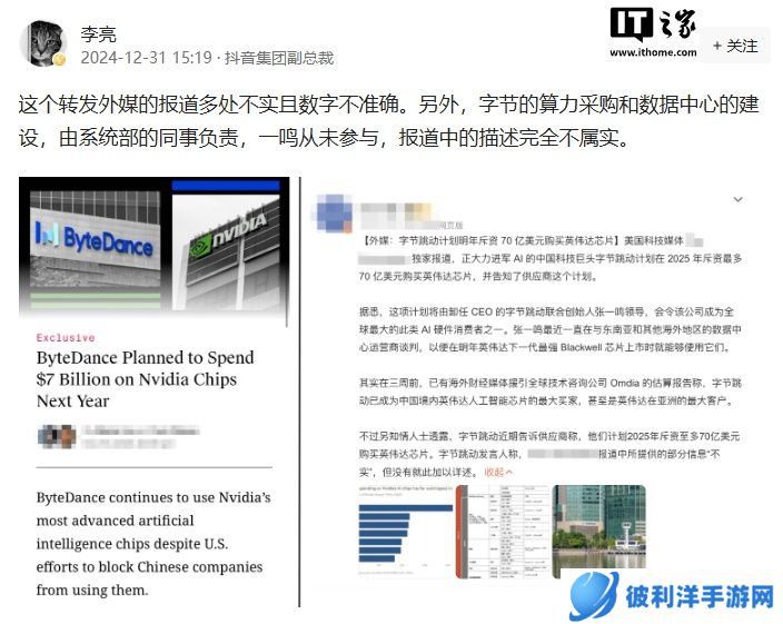 本站 12 月 31 日消息,针对The Information今日关于“字节跳动 70 亿美元购买英伟达芯片”的消息,抖音集团副总裁李亮称其中包含多处不实且数字不准确。