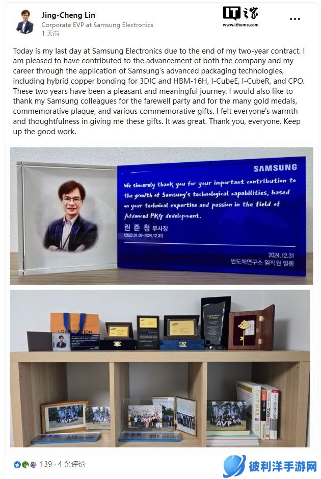 本站注意到,Jing-Cheng Lin 已在领英上确认了其从三星离职的消息,并表示其为期两年的合同已经到期。他还强调了自己在三星期间为先进封装技术做出的贡献,包括用于 3D IC 的混合铜键合技术以及 HBM-16H 的研发。