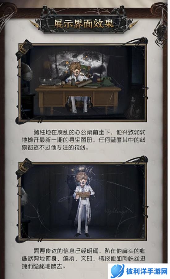 展示界面:冒险家随性地坐在凌乱的办公桌前,摊开最新一期的寻宝图册,专注地寻找线索。肩头的蜘蛛默契地协助他编撰、印刷情报,如同蛛丝般迅速而隐秘地传递信息。
